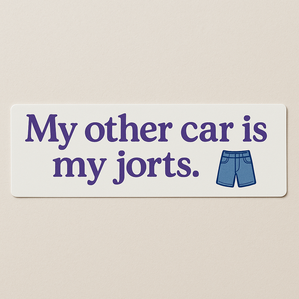 Behold: The Bumper Sticker. It doesn’t increase horsepower. It doesn’t improve gas mileage. But it does let everyone on the highway know you’re living the jorts lifestyle.